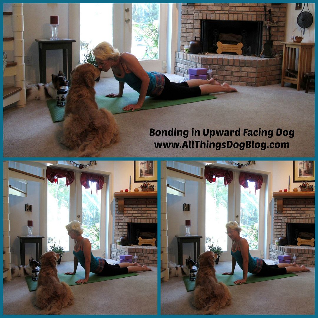 While working in the Cobra and Upward Facing Dog poses, you'll soon find that reaching out to bond with your dog takes a bit of creativity. Besides setting a treat jar on the corner of the mat, I make use of my voice, eye contact and smooches. Asking for a "watch me" in conjunction with your dog's name quickly gets their attention on you when your hands are busy supporting your body.